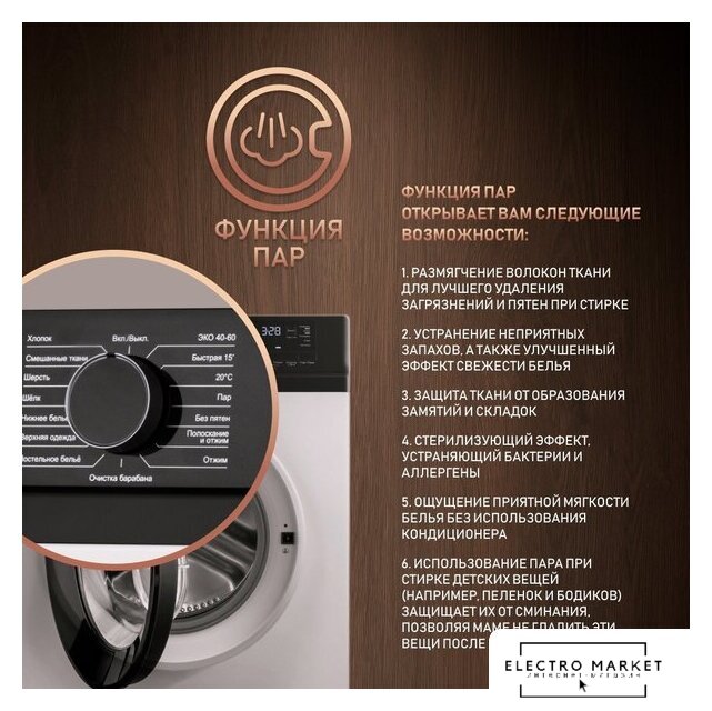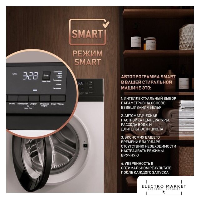 | Все программы | Smart, Хлопок, Верхняя одежда, Шерсть, Постельное бельё, Очистка барабана, Без пятен, Нижнее бельё, Шёлк, Пар, Быстрая 15’, Смешанные ткани, 20℃, ЭКО 40-60, Полоскание и отжим, Отжим |