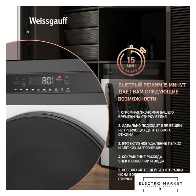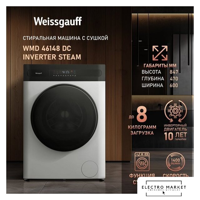 отдельностоящая, стирально-сушильная машина, загрузка до 8 кг, отжим 1400 об/мин, глубина 43 см (с люком 52 см), энергопотребление A+++, 15 программ