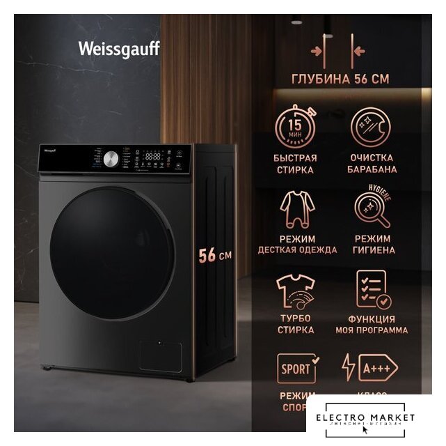 отдельностоящая, стирально-сушильная машина, загрузка до 8 кг, отжим 1400 об/мин, глубина 54 см, энергопотребление A+++, защита от протечек, 16 программ