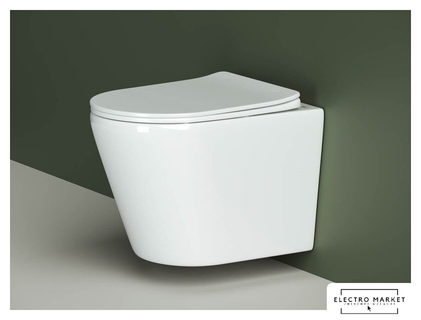 подвесной, конструкция: без бачка, задний подвод воды, горизонтальный выпуск, с сиденьем, безободковый