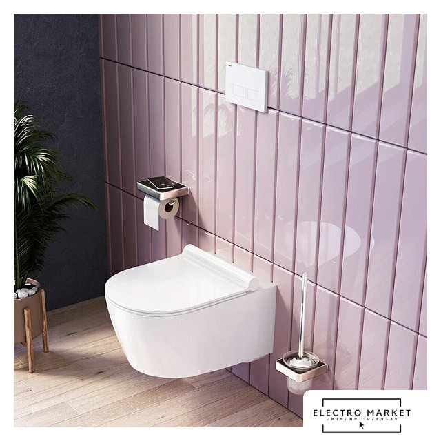подвесной, конструкция: без бачка, задний подвод воды, горизонтальный выпуск, двухрежимный слив, с сиденьем, безободковый