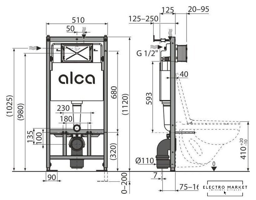 | Отверстия под инсталляцию | 180 мм |