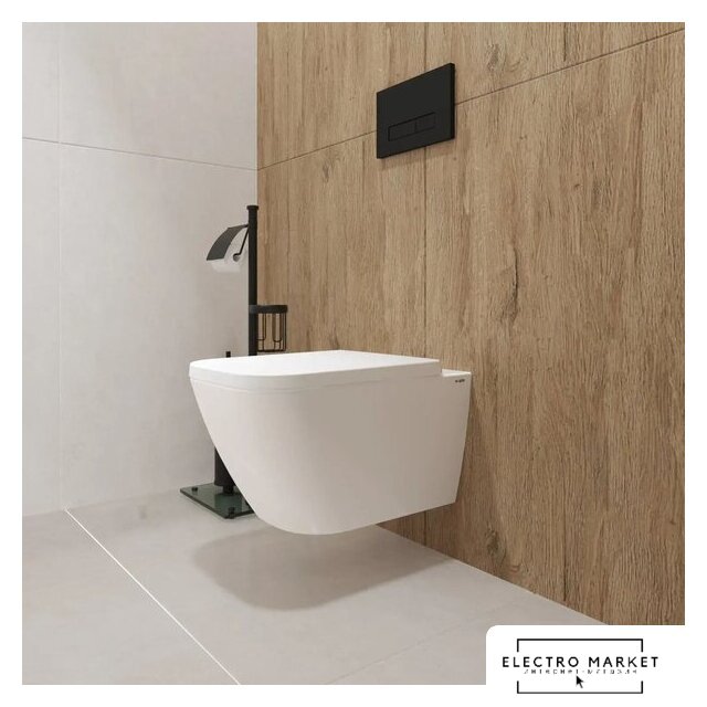 подвесной (с биде), конструкция: без бачка, задний подвод воды, горизонтальный выпуск, двухрежимный слив, с сиденьем, безободковый