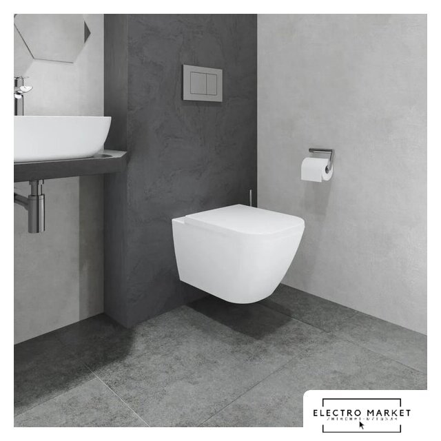 подвесной, конструкция: без бачка, задний подвод воды, горизонтальный выпуск, двухрежимный слив, с сиденьем, безободковый