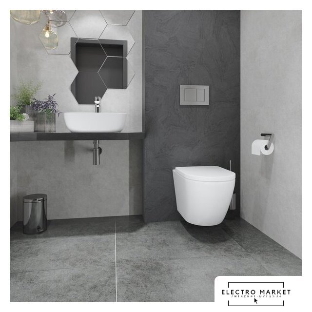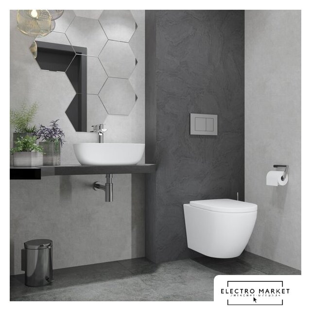 подвесной, конструкция: без бачка, задний подвод воды, горизонтальный выпуск, двухрежимный слив, с сиденьем, безободковый