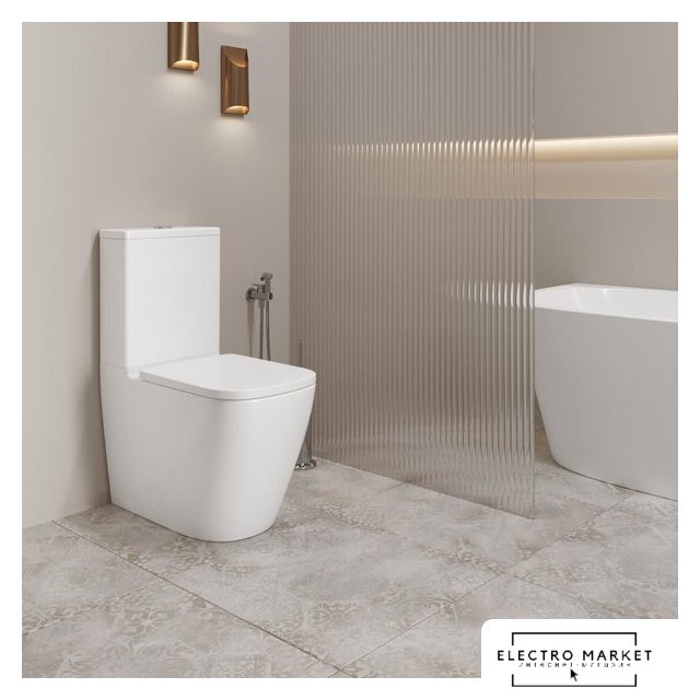 напольный (с биде), конструкция: компакт, боковой подвод воды, горизонтальный выпуск, двухрежимный слив, с сиденьем, безободковый