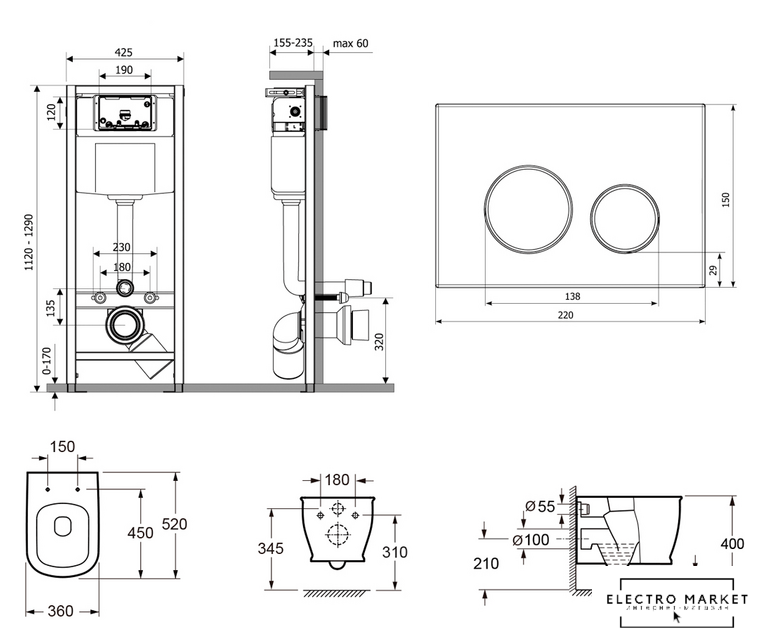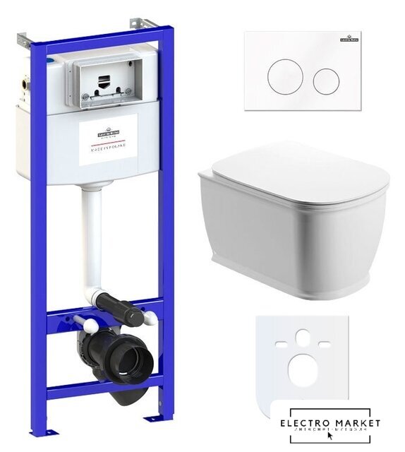подвесной, конструкция: без бачка, задний подвод воды, горизонтальный выпуск, двухрежимный слив, с сиденьем