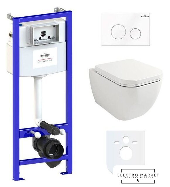 подвесной, без бачка, задний подвод воды, горизонтальный выпуск, двухрежимный слив, с сиденьем