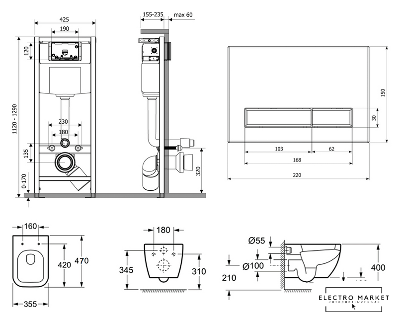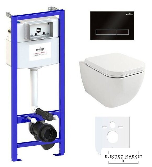 подвесной, без бачка, задний подвод воды, горизонтальный выпуск, двухрежимный слив, с сиденьем