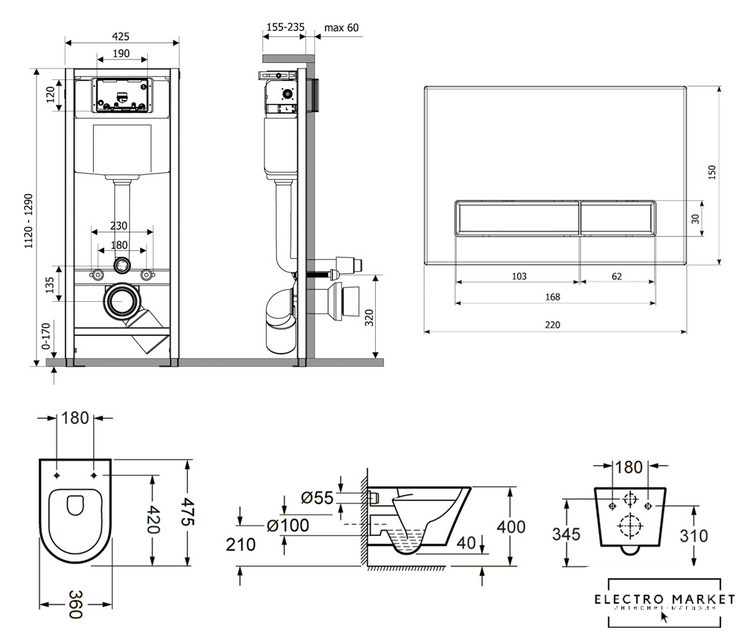 подвесной, без бачка, задний подвод воды, горизонтальный выпуск, двухрежимный слив, с сиденьем
