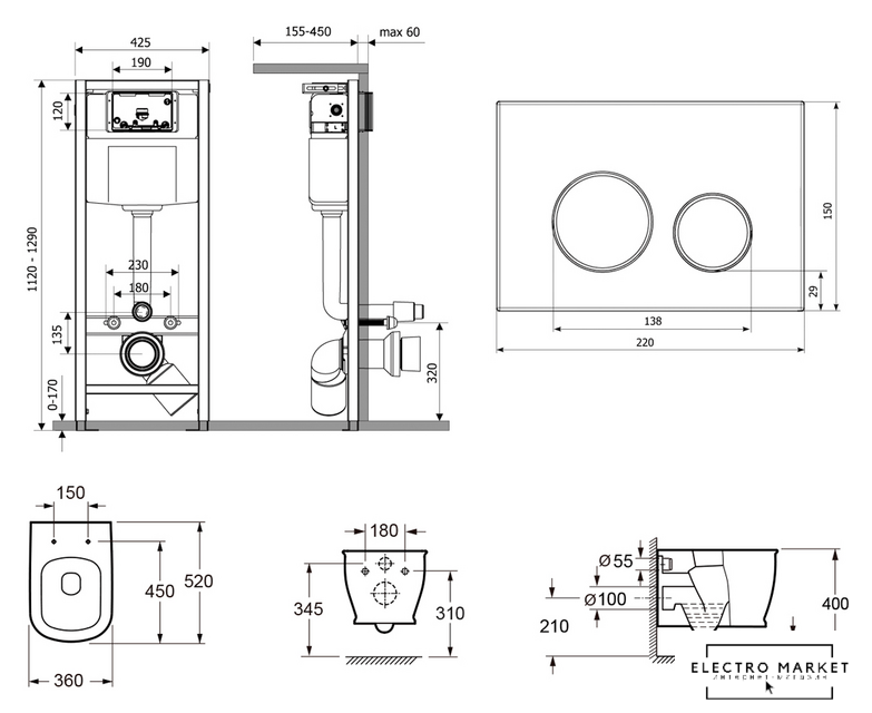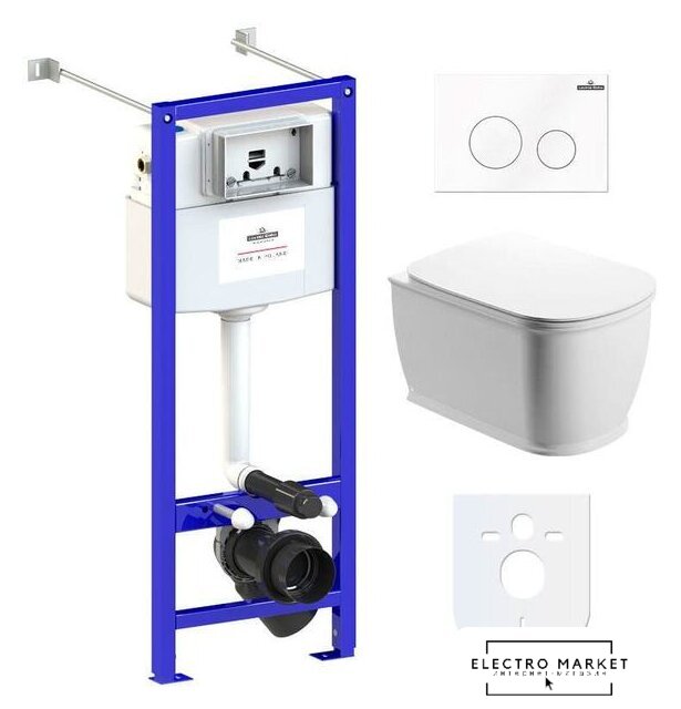 подвесной, без бачка, задний подвод воды, горизонтальный выпуск, двухрежимный слив, с сиденьем