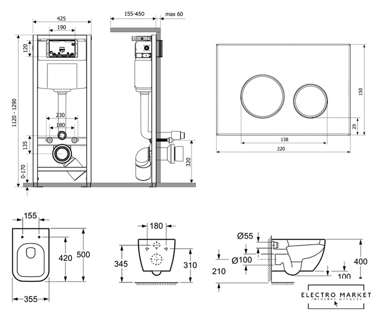 подвесной, без бачка, задний подвод воды, горизонтальный выпуск, двухрежимный слив, с сиденьем