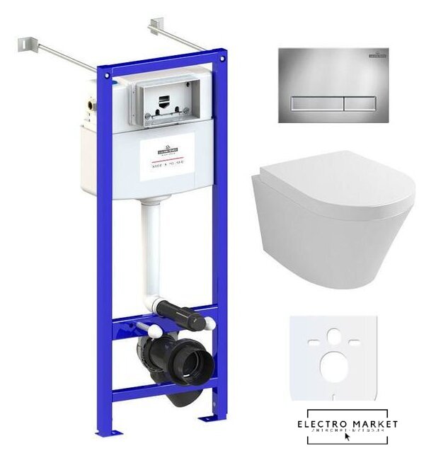 подвесной, без бачка, задний подвод воды, горизонтальный выпуск, двухрежимный слив, с сиденьем