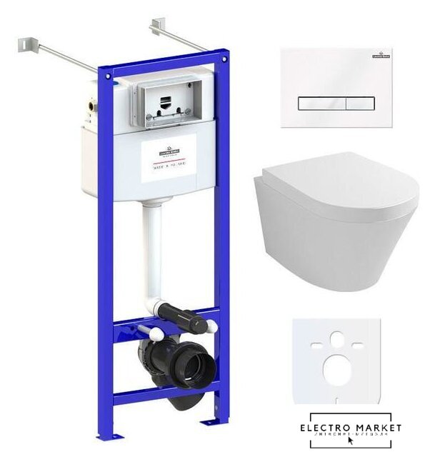 подвесной, без бачка, задний подвод воды, горизонтальный выпуск, двухрежимный слив, с сиденьем