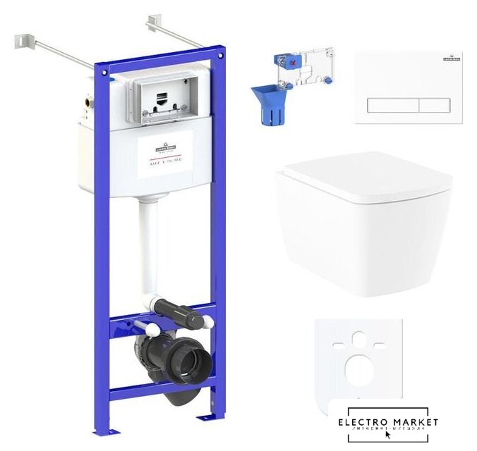 подвесной, без бачка, задний подвод воды, горизонтальный выпуск, двухрежимный слив, с сиденьем