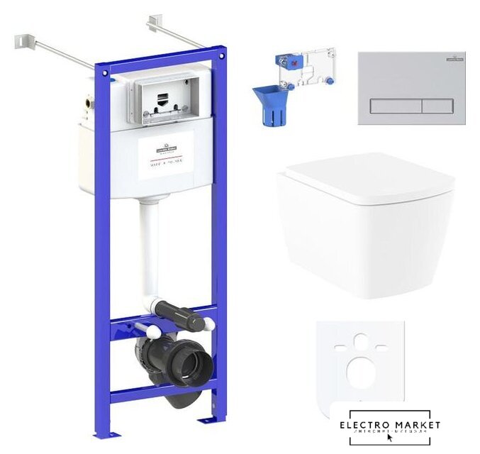 подвесной, без бачка, задний подвод воды, горизонтальный выпуск, двухрежимный слив, с сиденьем