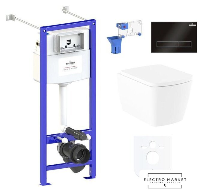 подвесной, без бачка, задний подвод воды, горизонтальный выпуск, двухрежимный слив, с сиденьем