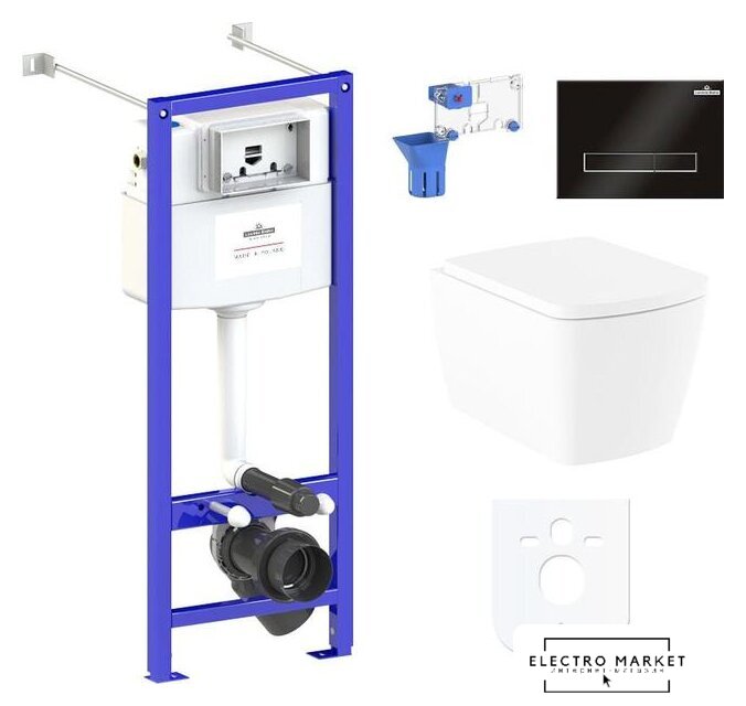 подвесной, без бачка, задний подвод воды, горизонтальный выпуск, двухрежимный слив, с сиденьем
