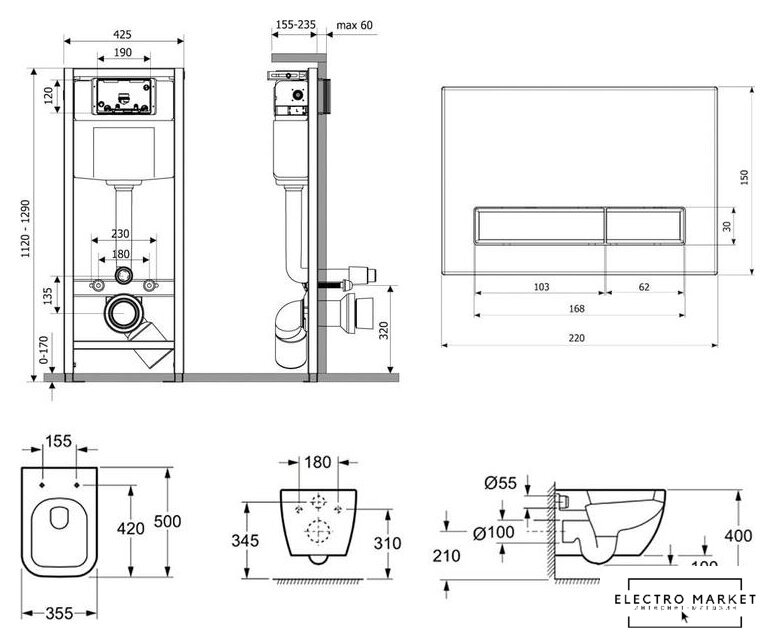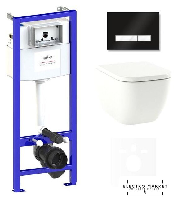 подвесной, без бачка, задний подвод воды, горизонтальный выпуск, двухрежимный слив, с сиденьем