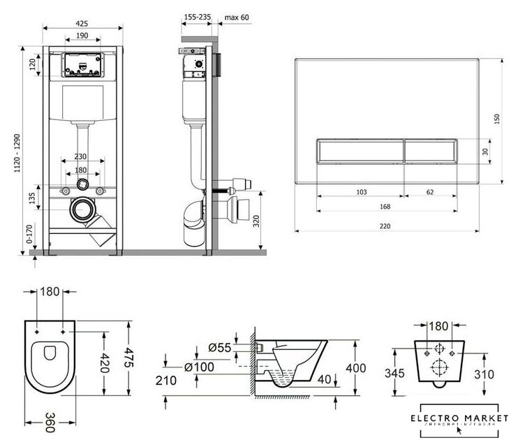 подвесной, конструкция: без бачка, двухрежимный слив
