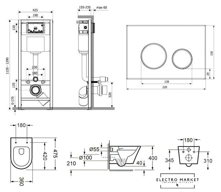 подвесной, без бачка, задний подвод воды, горизонтальный выпуск, двухрежимный слив, с сиденьем