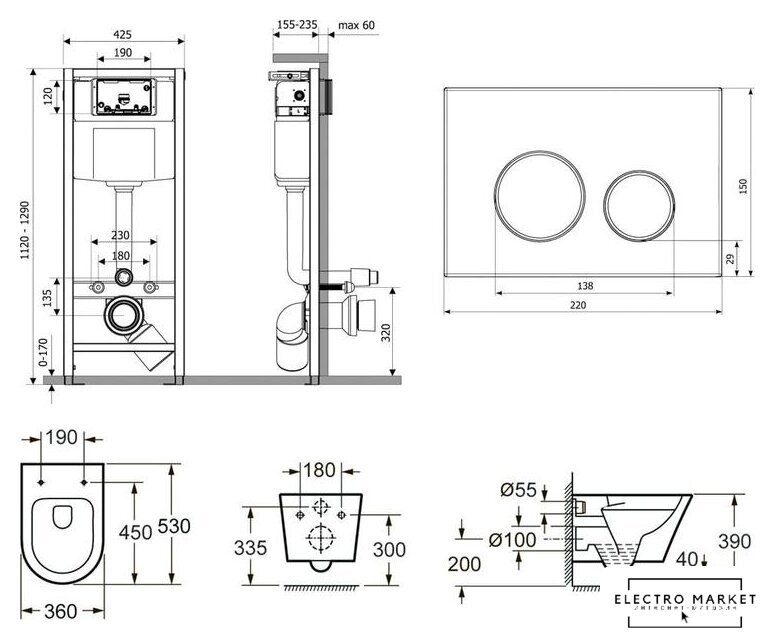 подвесной, конструкция: без бачка, двухрежимный слив