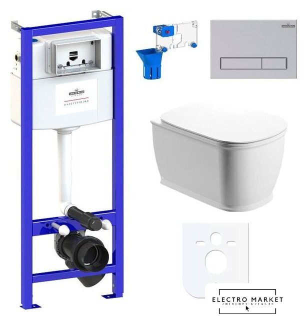 подвесной, без бачка, задний подвод воды, горизонтальный выпуск, двухрежимный слив, с сиденьем