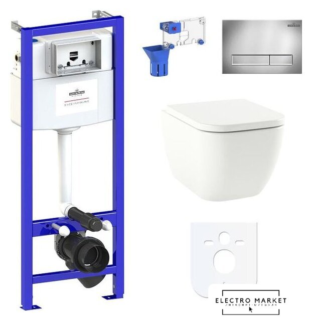 подвесной, конструкция: без бачка, задний подвод воды, горизонтальный выпуск, двухрежимный слив, с сиденьем