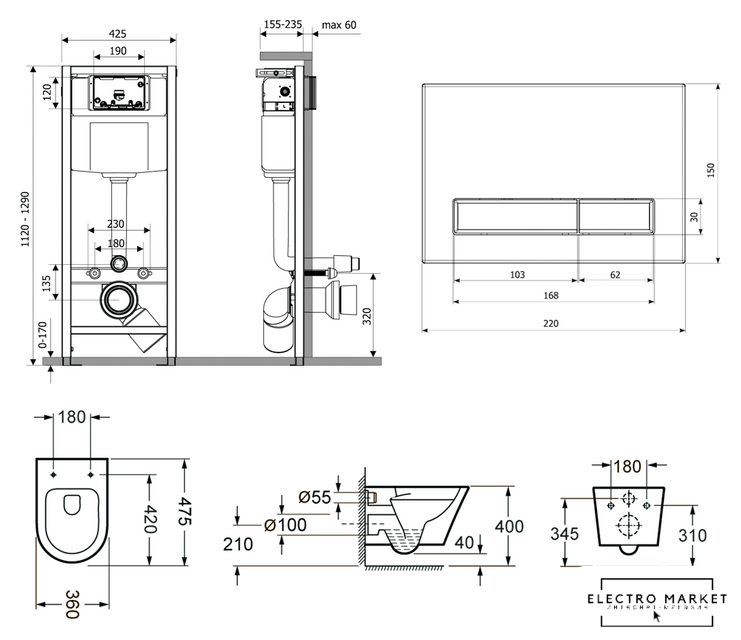подвесной, конструкция: без бачка, задний подвод воды, горизонтальный выпуск, двухрежимный слив, с сиденьем