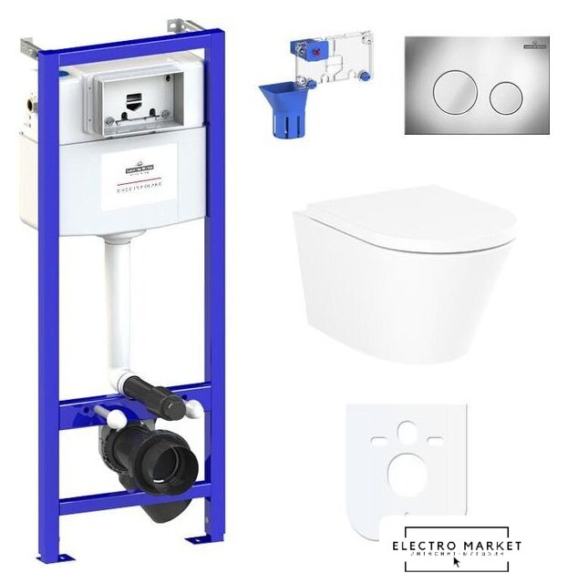подвесной, без бачка, задний подвод воды, горизонтальный выпуск, двухрежимный слив, с сиденьем