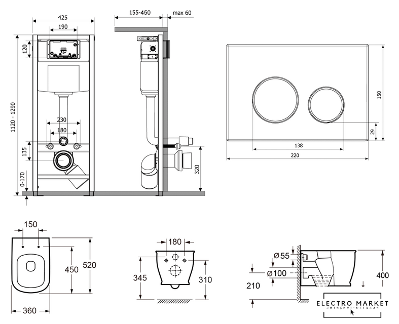 подвесной, конструкция: без бачка, задний подвод воды, горизонтальный выпуск, двухрежимный слив, с сиденьем