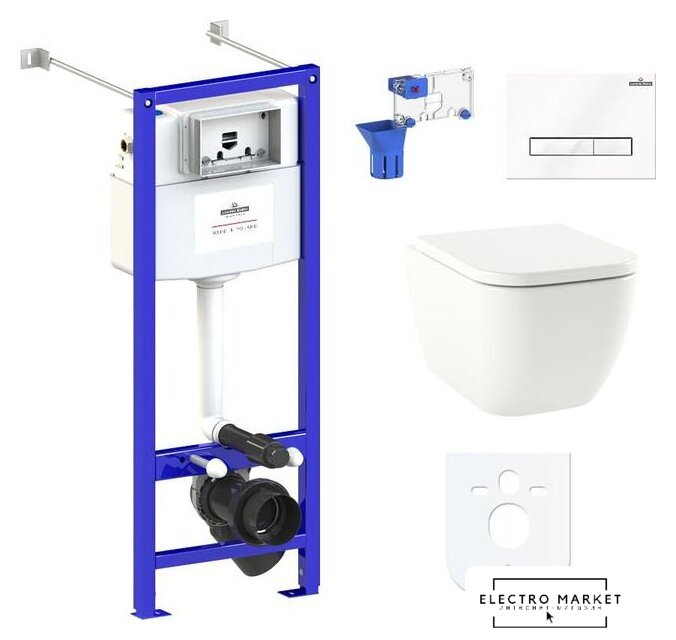 подвесной, конструкция: без бачка, задний подвод воды, горизонтальный выпуск, двухрежимный слив, с сиденьем