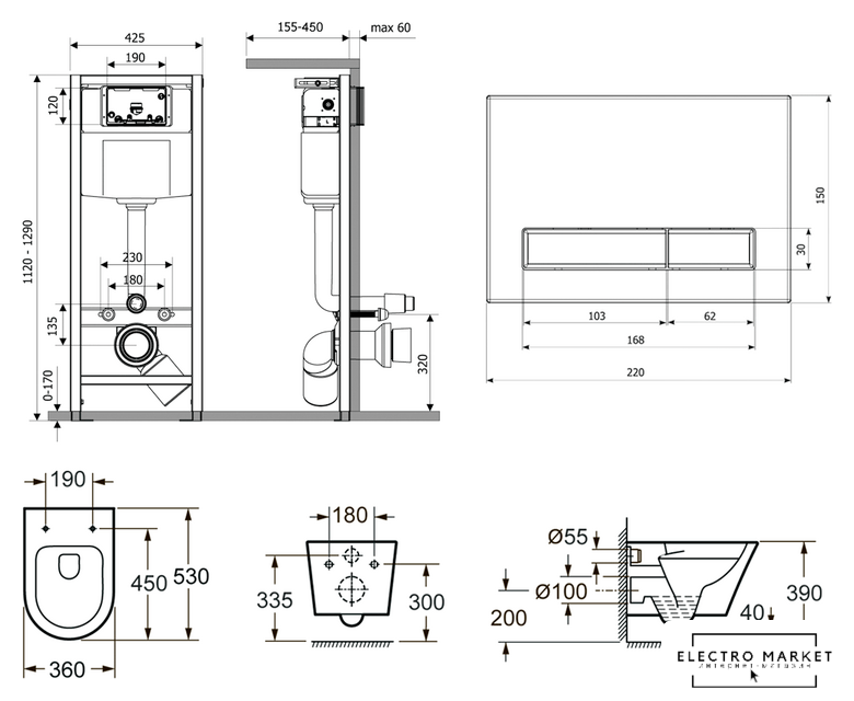 подвесной, без бачка, задний подвод воды, горизонтальный выпуск, двухрежимный слив, с сиденьем