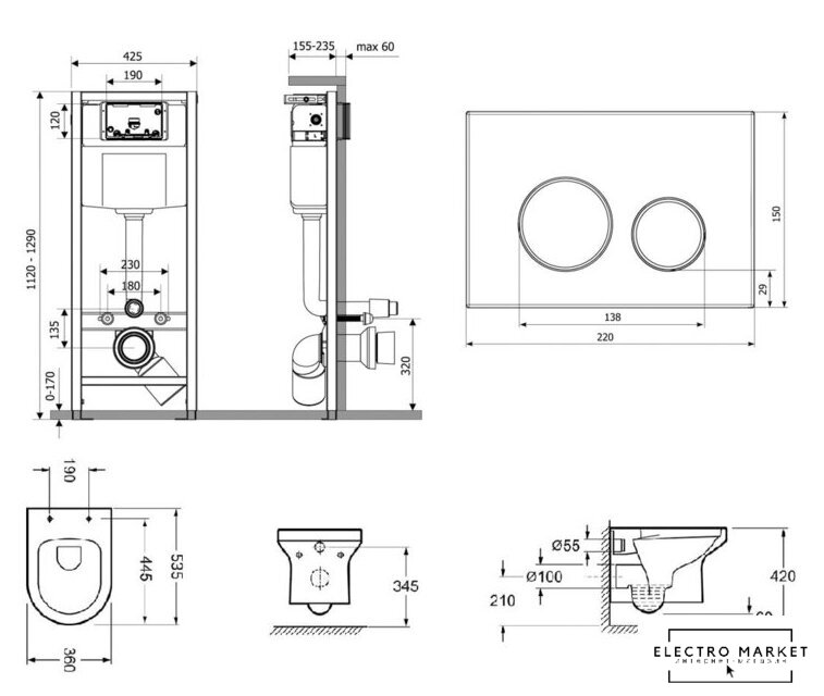 подвесной, без бачка, задний подвод воды, горизонтальный выпуск, двухрежимный слив, с сиденьем