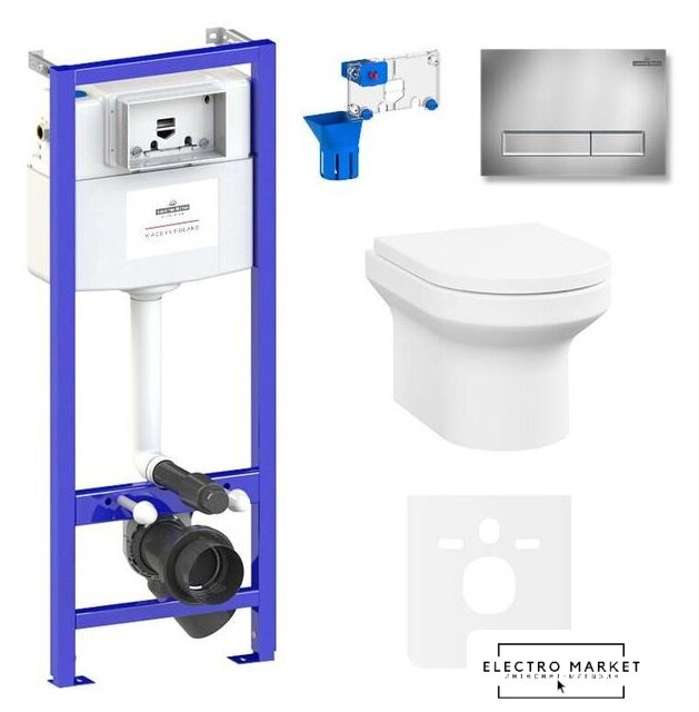 подвесной, без бачка, задний подвод воды, горизонтальный выпуск, двухрежимный слив, с сиденьем