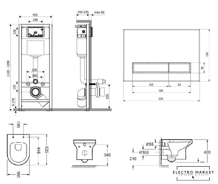 подвесной, без бачка, задний подвод воды, горизонтальный выпуск, двухрежимный слив, с сиденьем