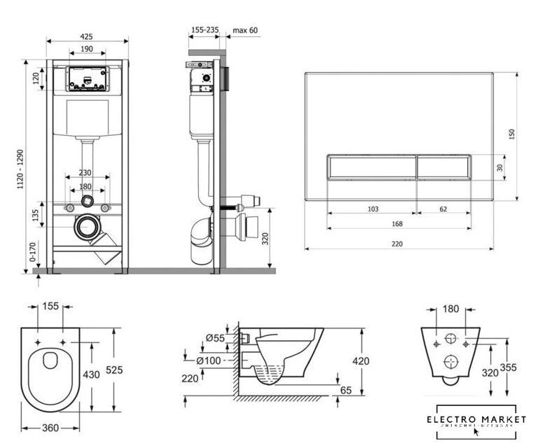 подвесной, без бачка, задний подвод воды, горизонтальный выпуск, двухрежимный слив, с сиденьем