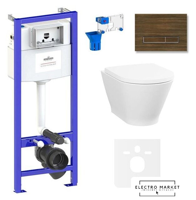 подвесной, без бачка, задний подвод воды, горизонтальный выпуск, двухрежимный слив, с сиденьем