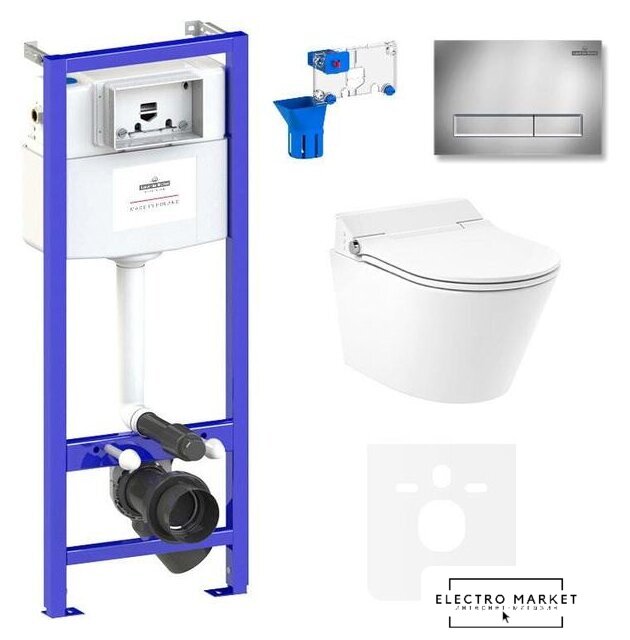 умный (электронный) унитаз, подвесной (с биде), конструкция: без бачка, задний подвод воды, горизонтальный выпуск, двухрежимный слив, с сиденьем, безободковый