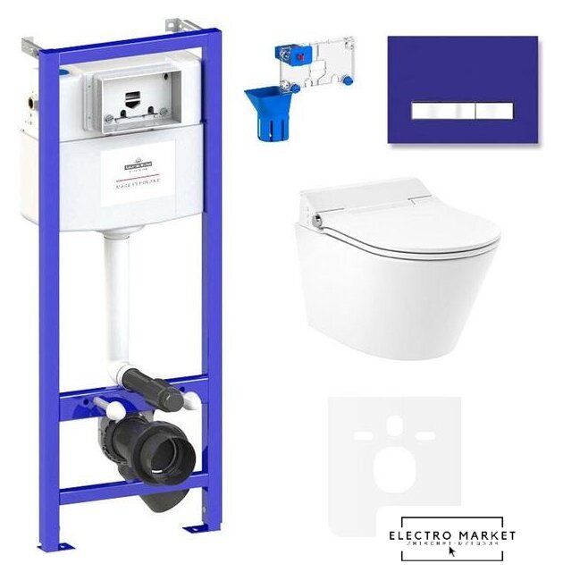 умный (электронный) унитаз, подвесной (с биде), конструкция: без бачка, задний подвод воды, горизонтальный выпуск, двухрежимный слив, с сиденьем, безободковый