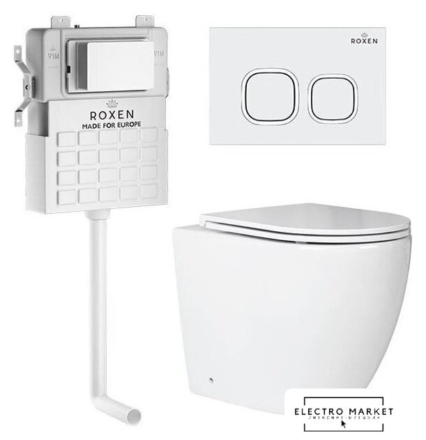 приставной, конструкция: без бачка, задний подвод воды, горизонтальный выпуск, двухрежимный слив, с сиденьем, безободковый