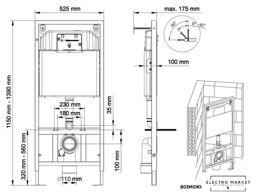 | Отверстия под инсталляцию | 180 мм |