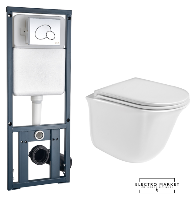 подвесной, конструкция: без бачка, задний подвод воды, горизонтальный выпуск, двухрежимный слив, с сиденьем, безободковый