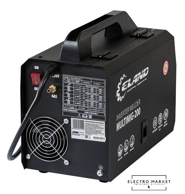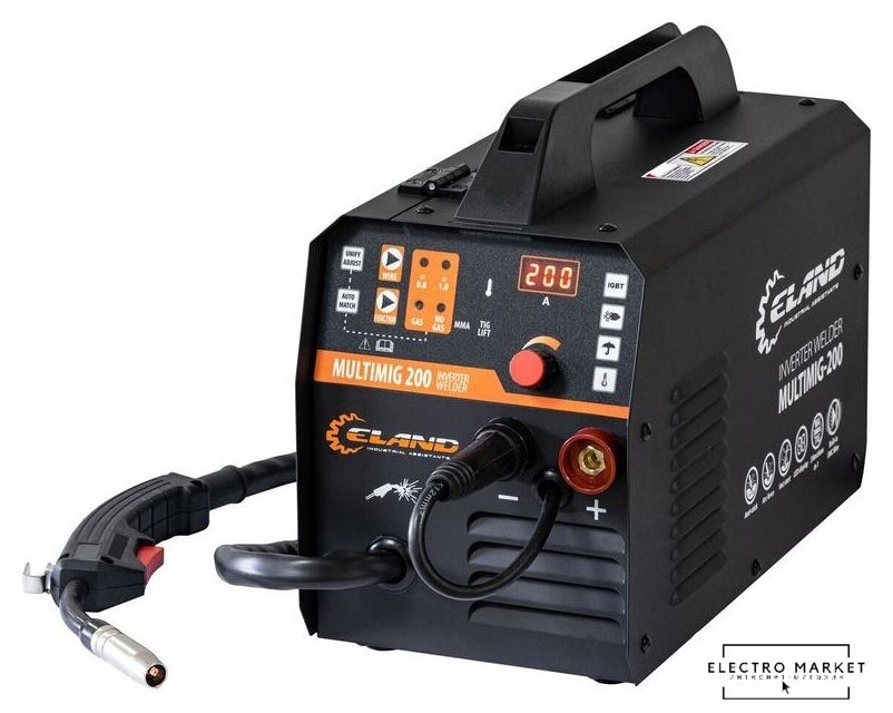 ручная дуговая сварка (MMA)/полуавтоматическая сварка (MIG MAG FCAW)/аргонодуговая сварка (TIG), входное напряжение 220 В, сварочный ток: 20–200 А, диаметр электрода: 1.6–4 мм, 12 кг