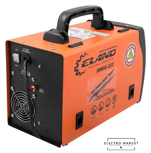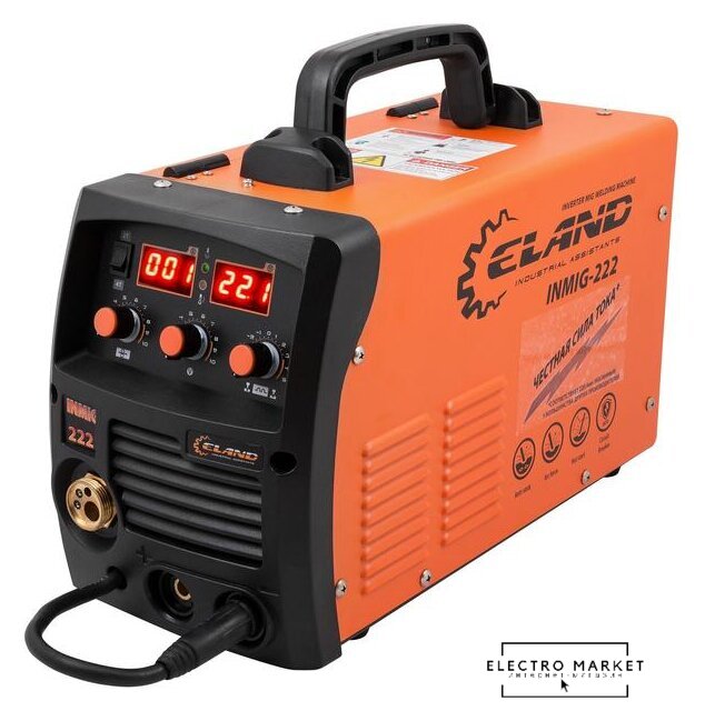 ручная дуговая сварка (MMA)/полуавтоматическая сварка (MIG MAG), 220 В, сварочный ток: 40–200 А, диаметр электрода: 0.6–1 мм, 21 кг