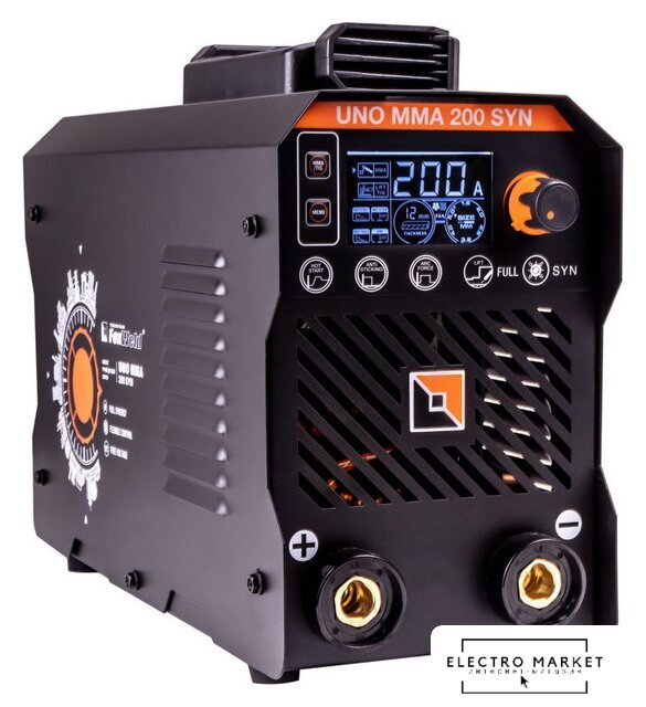 ручная дуговая сварка (MMA)/полуавтоматическая сварка (MIG MAG FCAW)/аргонодуговая сварка (TIG), входное напряжение 220 В, сварочный ток: 20–200 А, диаметр электрода: 1.6–4 мм, 12 кг