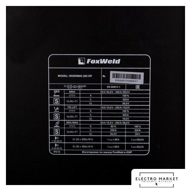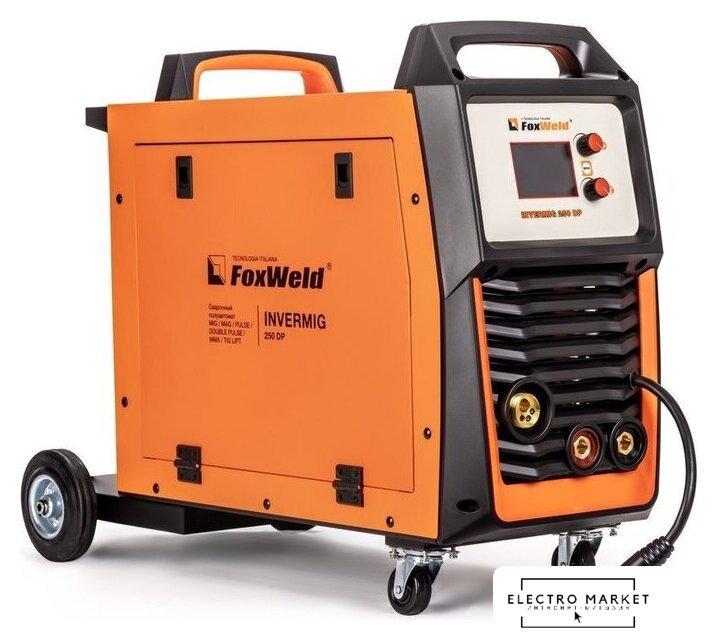 | Комплект поставки | • Сварочный полуавтомат FOXWELD INVERMIG 250 DP – 1 шт.;• Горелка MB 24 MIG 3 м (с каналом 0,8 - 1,0 мм для стали) – 1 шт.;• Электрододержатель 300 А 25 мм², 3 м – 1 шт.;• Масса с зажимом 300 А 25 мм², 3 м – 1 шт.;• Тефлоновый канал (красный 1,0/1,2) 3 м для сварки алюминия – 1 шт.;• Контактные наконечники для стали 0,8 мм – 2 шт.;• Контактные наконечники для стали 1,0 мм – 2 шт.;• Контактные наконечники для алюминия 1,0 мм – 2 шт.;• Контактные наконечники для алюминия 1,2 мм – 2 шт.;• Ролик с V-образной канавкой 0,8/1,0 мм – 2 шт. (в аппарате);• Ролик с U-образной канавкой 1,0/1,2 мм – 2 шт.;• Хомут для шланга – 2 шт.;• Газовый шланг 3 м – 1 шт.;• Руководство пользователя – 1 шт.;• Гарантийный талон (5 лет) – 1 шт. |