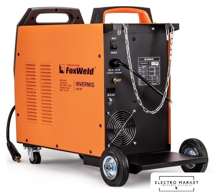 ручная дуговая сварка (MMA)/полуавтоматическая сварка (MIG/MAG), входное напряжение 380 В, сварочный ток: 40-350 А, диаметр электрода: 2–6 мм, 26 кг