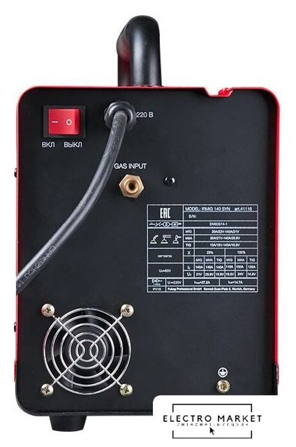 ручная дуговая сварка (MMA)/полуавтоматическая сварка (MIG MAG)/аргонодуговая сварка (TIG), 220 В, сварочный ток: 10–200 А, диаметр электрода: 2.4–4 мм, 9.8 кг