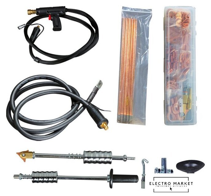 | Комплект поставки | - Провод масса для точечной сварки (1 шт.), - Провод с пистолетом для сварки (1 шт.), - Обратный молоток для точечной сварки (1 шт.), - Ручной многофункциональный молоток для точечной сварки с треугольником (1 шт.), - Присоска ручная (1 шт.), - Шестигранный ключ (1 шт.), - Гребенка с 6-тью зацепами (1 шт.), - Крючок для обратного молотка (2 шт.), - Электрод угольный 350мм (5 шт.),- Электрод "треугольник" (10 шт.),- Кольца для вытягивания вмятин (10 шт.),- Шайба для вытягивания вмятин M4 (5 шт.), - Шайба для вытягивания вмятин M5 (5 шт.), - Шайба для вытягивания вмятин M6 (5 шт.), - Шпилька М4*20 (30 шт.), - Шпилька M5*20 (30 шт.), - Шпилька M6*20 (30 шт.), - Кольцо 12мм (15 шт.), - Кольцо 10мм (15 шт.), - Держатель электрода "треугольник" (1 шт.), - Точечный контактор – устройство крепления обратного кабеля (1 шт.), - Держатель угольного электрода (1 шт.), - Держатель круглых шайб (1 шт.), - Цанга для шпильки M4 (1 шт.), - Цанга для шпильки M5 (1 шт.), - Цанга для шпильки M6 (1 шт.), - Электрод точка для контактной сварки (1 шт.), - Электрод плоский для волнистой проволоки (1 шт.), - Волнистая проволока 32 мм (15 шт.) |